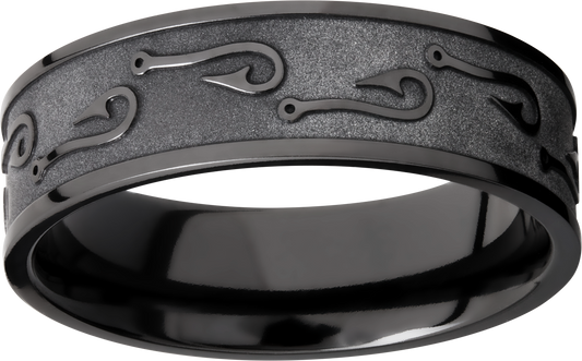 Zirconium 7mm flat band with a laser-carved fishhook pattern