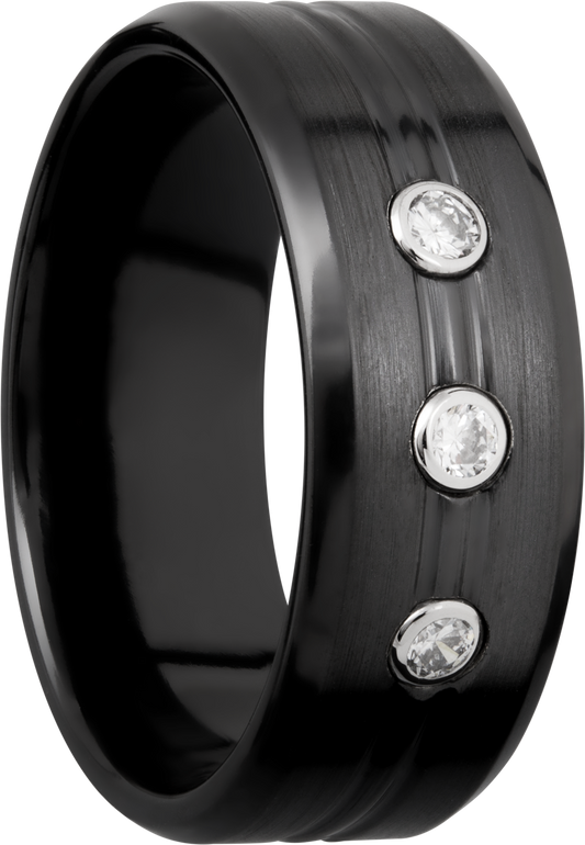 Zirconium 8mm beveled band with 3, .05ct bezel-set diamonds