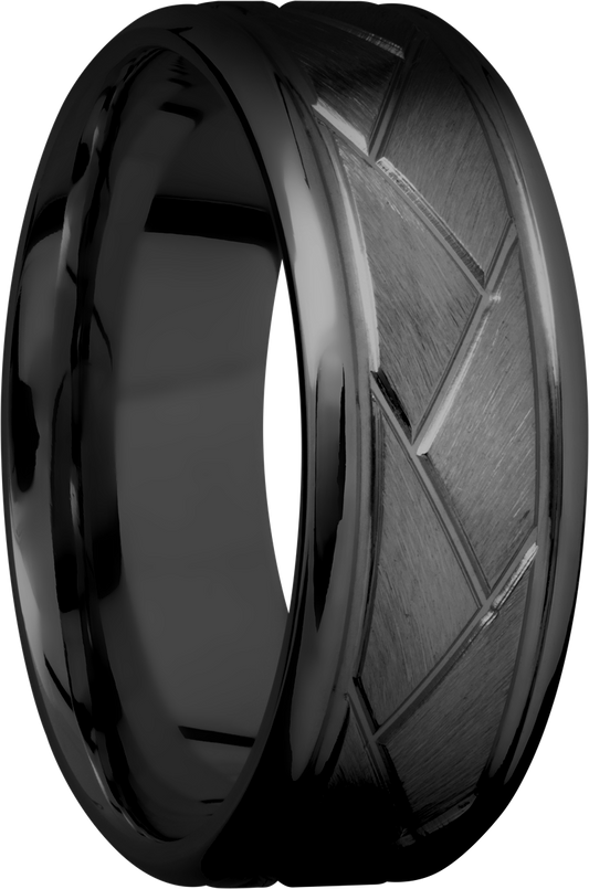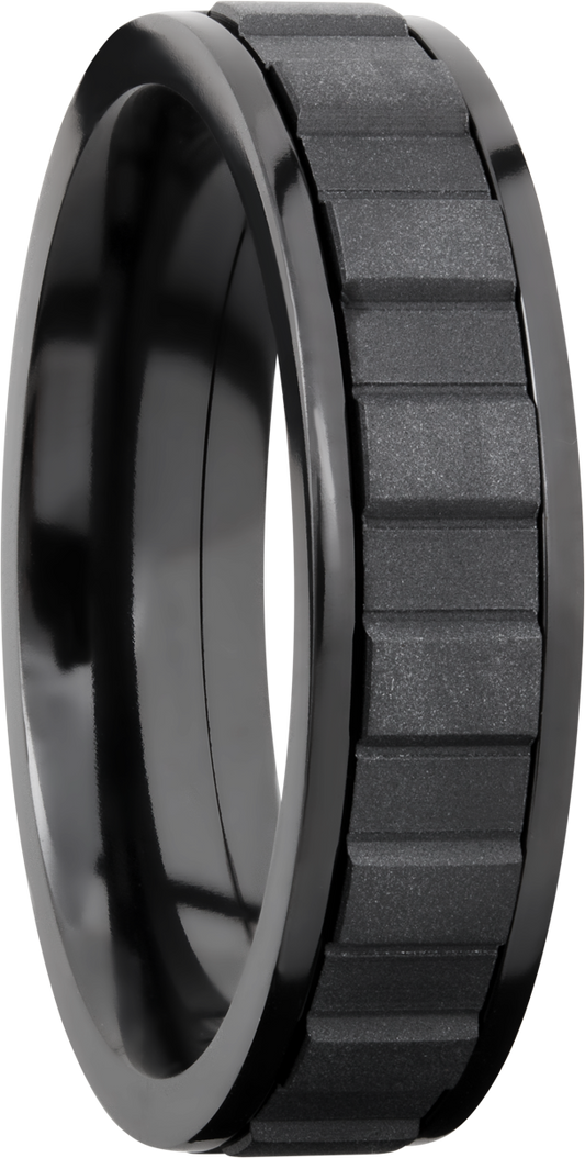 Zirconium 7mm beveled band with reverse milgrain detail and a laser-carved stripe pattern